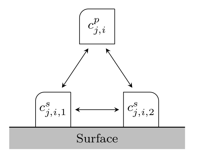 Small molecules that can enter any pore have \(F_{\text{acc},j,i} = 1\), whereas larger molecules that can enter some, but not small pores, have values \(0 < F_{\text{acc},j,i} < 1\). The other extreme is given by molecules so large that they cannot enter any pore and, consequently, \(F_{\text{acc},j,i} = 0\). Note that \(F_{\text{acc},j,i} = 0\) is not allowed in a simulation, which can be circumvented by setting \(k_{f,j,i} = 0\).